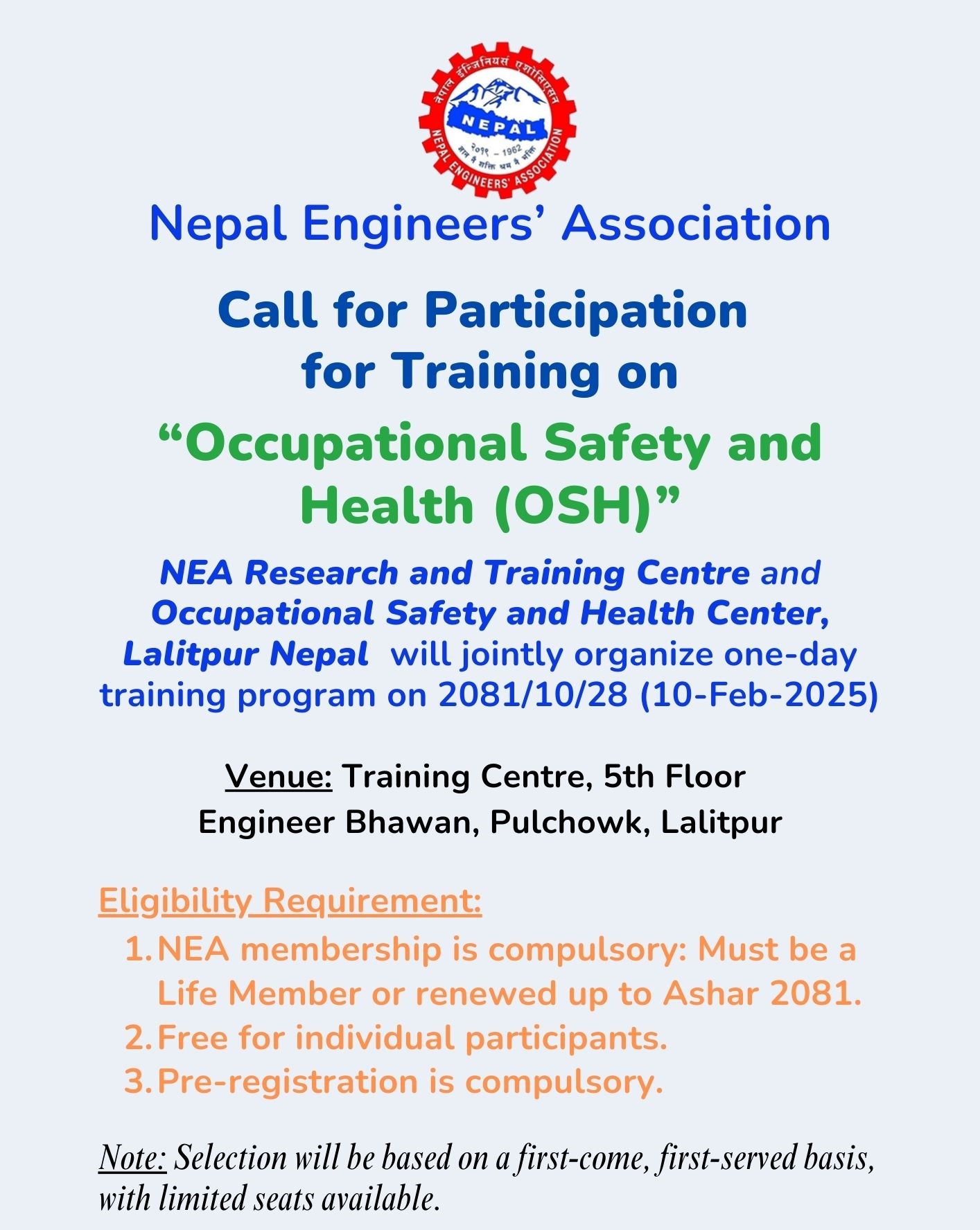 व्यवसायजन्य सुरक्षा तथा स्वास्थ्य केन्द्र (OSH) भैँसेपाटी, ललितपुरको सहकार्य एवं सहयोगमा आज मिति २०८१ माघ २८ गते सोमबार "व्यवसायजन्य सुरक्षा तथा स्वास्थ्य सम्बन्धी १ (एक) दिने सचेतनात्मक तालिम" सफलतापूर्वक सम्पन्न भएको छ। नेपाल इन्जिनियर्स एशोसिएसनको पुल्चोकस्थित भवनको प्रशिक्षण केन्द्रमा सम्पन्न उक्त तालिमबाट ३० जना युवा इन्जिनियर/आर्किटेक्टहरू लाभान्वित भएका छन्।
