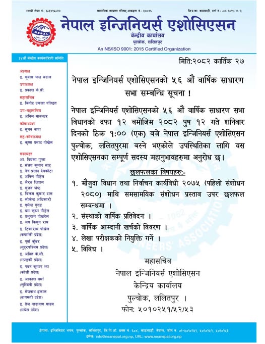 नेपाल इन्जिनियर्स एशोसिएसनको 56 ‌औं वार्षिक साधारण सभा सम्बन्धि सूचना !